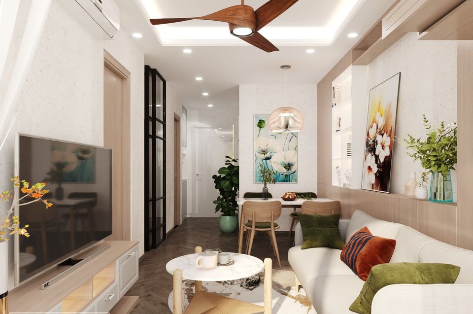 - Phong cách hiện đại: Tranh canvas, kệ gỗ đơn giản.